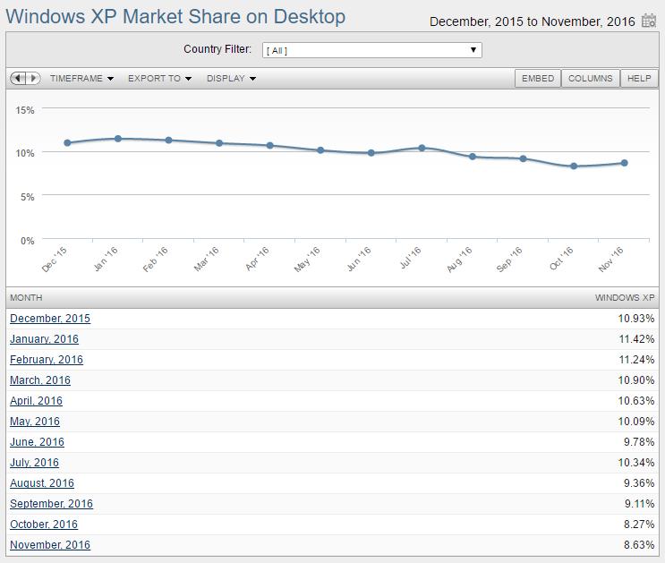 从 NetMarketShare 提供的统计看, 2016 年 11 月显示 Windows XP 不但不在下降,反而还在上升。考虑到该系统已不再被支持,这个现象是令人惊讶和担忧的。