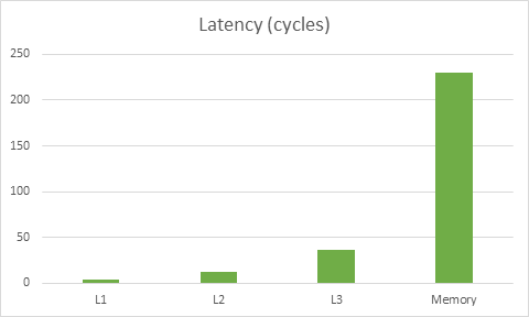 针对这款 CPU 读取内存的延迟,CPU 需要消耗近 230 个运算周期从内存读取数据,同时需要消耗 4 个运算周期来读取 L1 缓冲区。因此错误的去使用缓存可导致运行速度拖慢近 50 倍。还好这并不是最糟糕的——在现代 CPU 中它们能同时地做多种操作,所以当你加载 L1 缓冲区内容的同时这个内容已经进入到了寄存器,因此数据从 L1 缓冲区加载这个过程的性能消耗就被部分或完整的掩盖了起来。