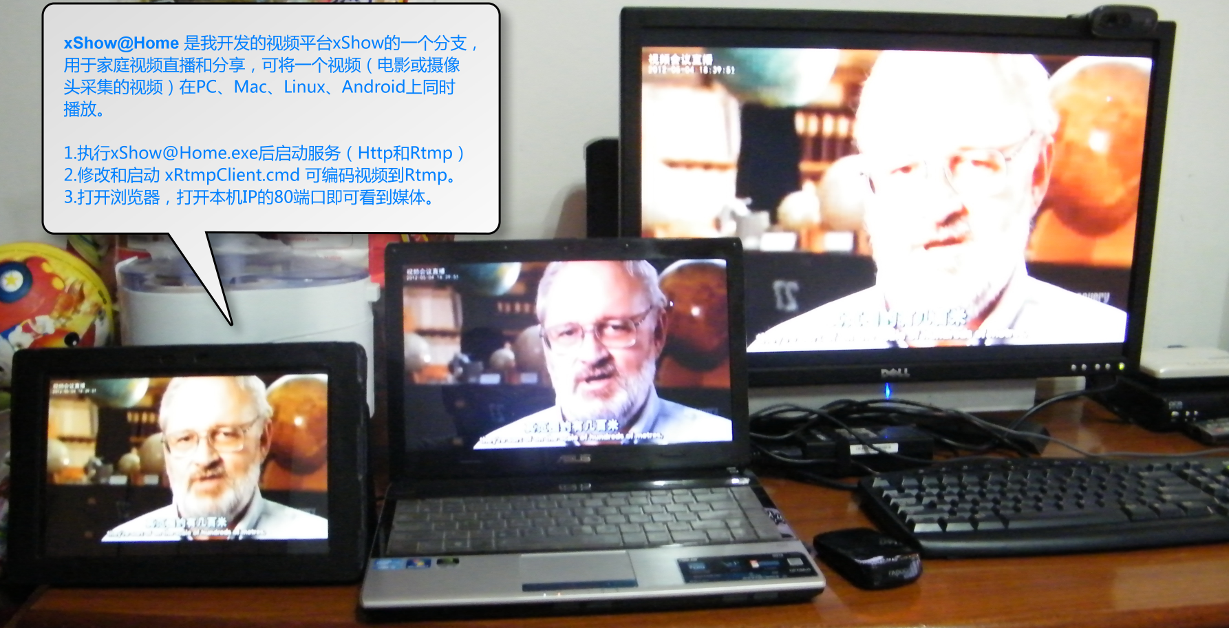 xShow@Home 是我开发的视频平台xShow的一个分支,用于家庭视频直播和分享,可将一个视频(电影或摄像头采集的视频)在PC、Mac、Linux、Android上同时播放。软件是FreeWare,暂时不提供源码,等分支稳定后我会开放源代码。