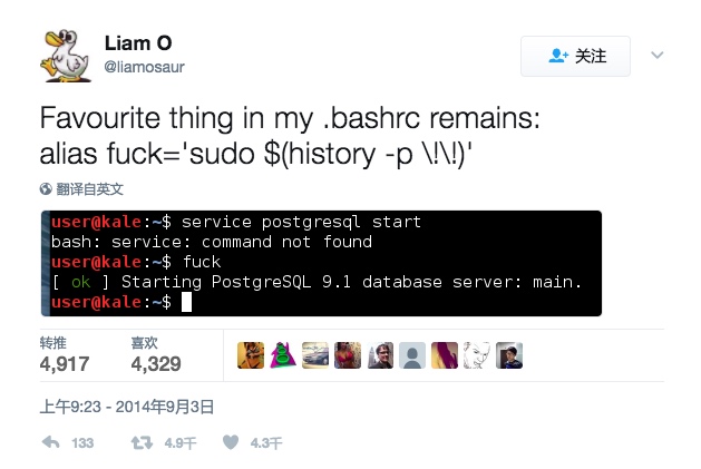 上述安装的软件包名字是:“thefuck”——别问我为啥不能直接叫 “fuck”。所以,你可以设置个别名: