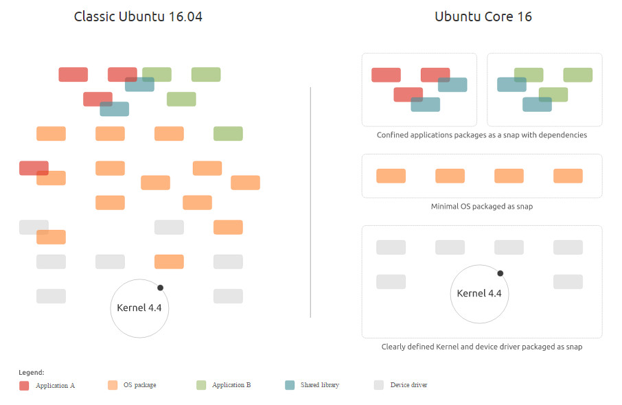 传统 Ubuntu(左)架构 与 Ubuntu Core 16