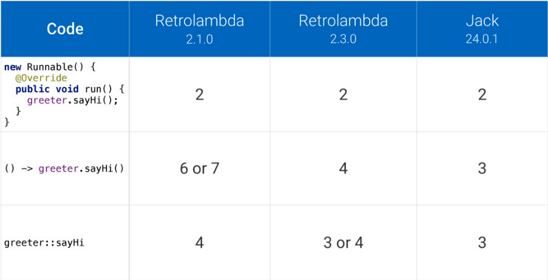 该表展示了使用不同版本的 Retrolambda 和 Jack 编译器生成的方法数量。该比较结果来自 Jake Wharton 的“探索 Java 的隐藏成本” 技术讨论之中。