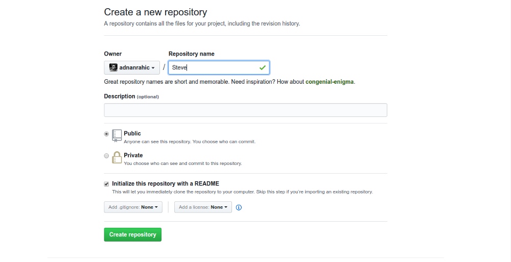 完成了安装过程,很好。现在你需要在你的浏览器地址栏输入 github.com 访问该网站。如果你还没有帐号的话需要新创建一个帐号,这就是你的起舞之处。登录并创建一个新仓库,命名为 Steve ,没有什么理由,只是想要一个名为史蒂夫的仓库好玩而已。选中 “Initialize this repository with a README” 复选框并点击创建按钮。现在你有了一个叫做 Steve 的仓库。我相信你会为你自己感到自豪。