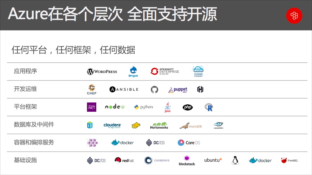 而作为微软近年来重中之重的 Azure 云业务,也在各个层面上全面支持开源。包括从底层的基础设施、容器、数据库和中间件,乃至于平台框架、应用程序。均采用和支持了大量的开源组件。