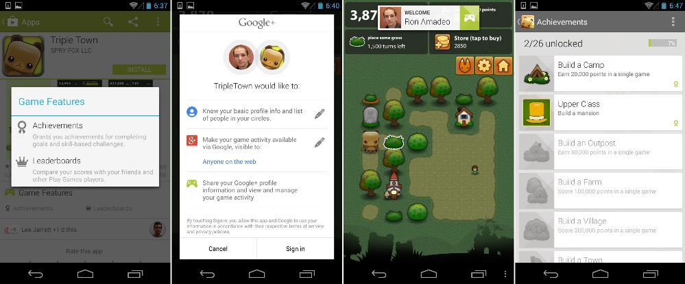 一个展示对 Google Play Games 支持的游戏。上面是 Play 商店游戏特性描述,登陆游戏触发的权限对话框,Play Games 通知,以及成就界面。 [Ron Amadeo 供图]