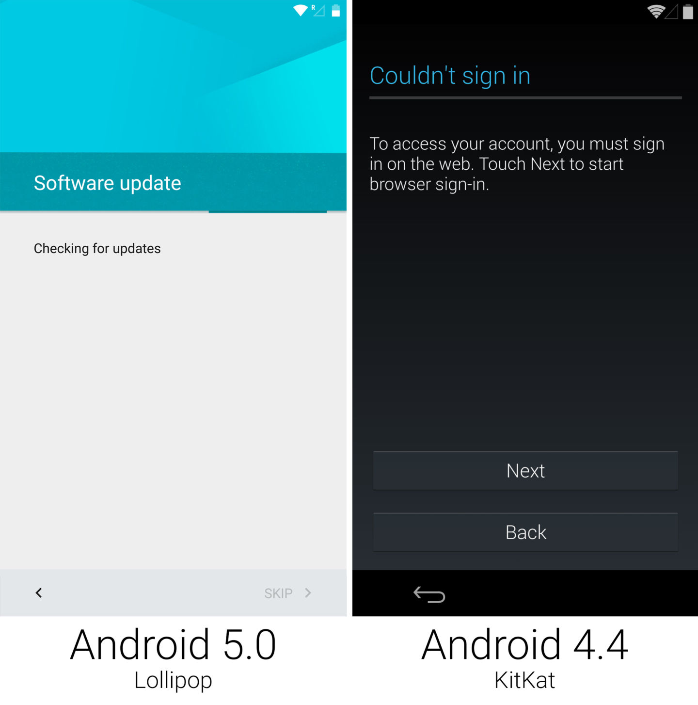 在棒棒糖中,开机设置工作的前几个界面和之前的很像。你可以看到“欢迎使用安卓界面”以及一些设置数据和 Wi-Fi 连接的选项。但在这个界面之后就有了变化。一旦棒棒糖连接到了互联网,它会连接到谷歌的服务器来“检查更新”。这并不是检查系统或应用的更新,是在检查即将执行的设置工作的更新。安卓下载了最新版本的设置,然后它会要求你登录你的谷歌账户。