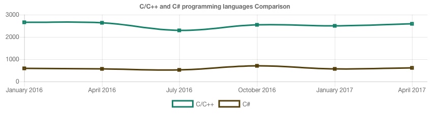 在应用程序领域中使用的另一种语言是 C++。虽然它的数量不能与 Java 竞争,但它仍然在这个领域占据了很大的市场份额。而且每 3 个招聘中有一个要求 Java,C++ 则是每 4 个中有一个要求它。与 Java 非常类似,其数量在过去六个季度中保持相对稳定。C++ 一直被大量使用,即使 Java 已经取代它,它仍然是一种高度相关的语言。
