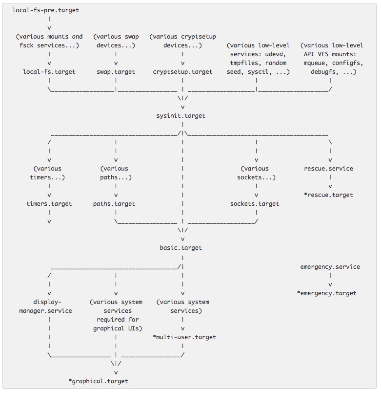 如下图 1 是直接从 bootup 的 man 页面拷贝而来。它展示了在 systemd 启动过程中一般的事件序列和确保成功的启动的基本的顺序要求。