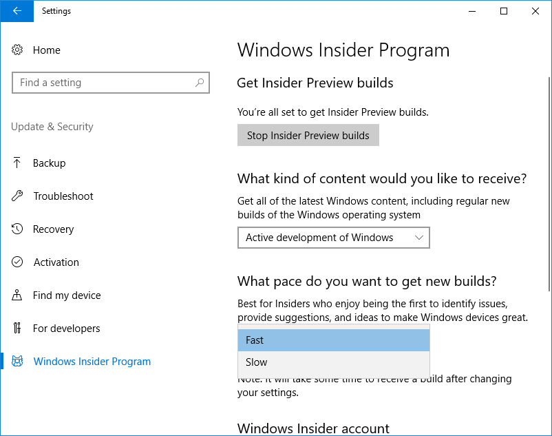 然后你可以选择你希望从 Windows 预览体验计划中收到何种内容。要得到 Docker 技术所需要的 Hyper-V 隔离功能,你需要加入“快圈”,两次确认后,重启 Windows。重启后,你需要等待你的机器安装各种更新后才能进行下一步。