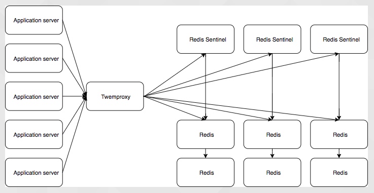 将会有大量的应用服务器与 twemproxy 进行通信,这会将它们的调用路由到合适的 Redis 主节点,twemproxy 将从 sentinal 集群获取主节点的信息,它将控制哪台 Redis 实例是主,哪台是从。这个设置是复杂的,而且仍有单点故障,它依赖于 twemproxy 来处理分片,来连接到正确的 Redis 实例。它具有对应用程序透明的优点,所以我们可以在理论上做到将现有的应用程序转移到这个 Redis 配置,而不用改变应用程序。但是我们要从头开始构建一个应用程序,所以迁移应用程序不是一个必需条件。