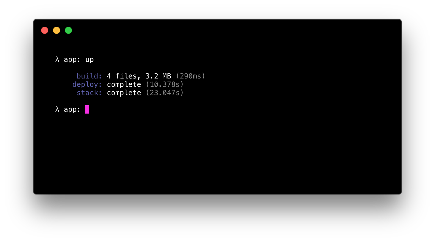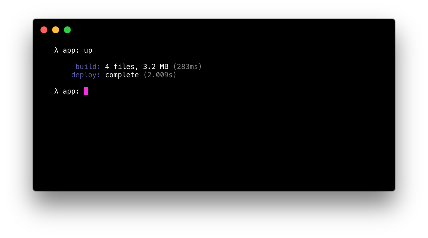 要部署应用程序输入 up 来创建所需的资源并部署应用程序本身。这里没有模糊不清的地方,一旦它说“完成”了那就完成了,该应用程序立即可用 —— 没有远程构建过程。
