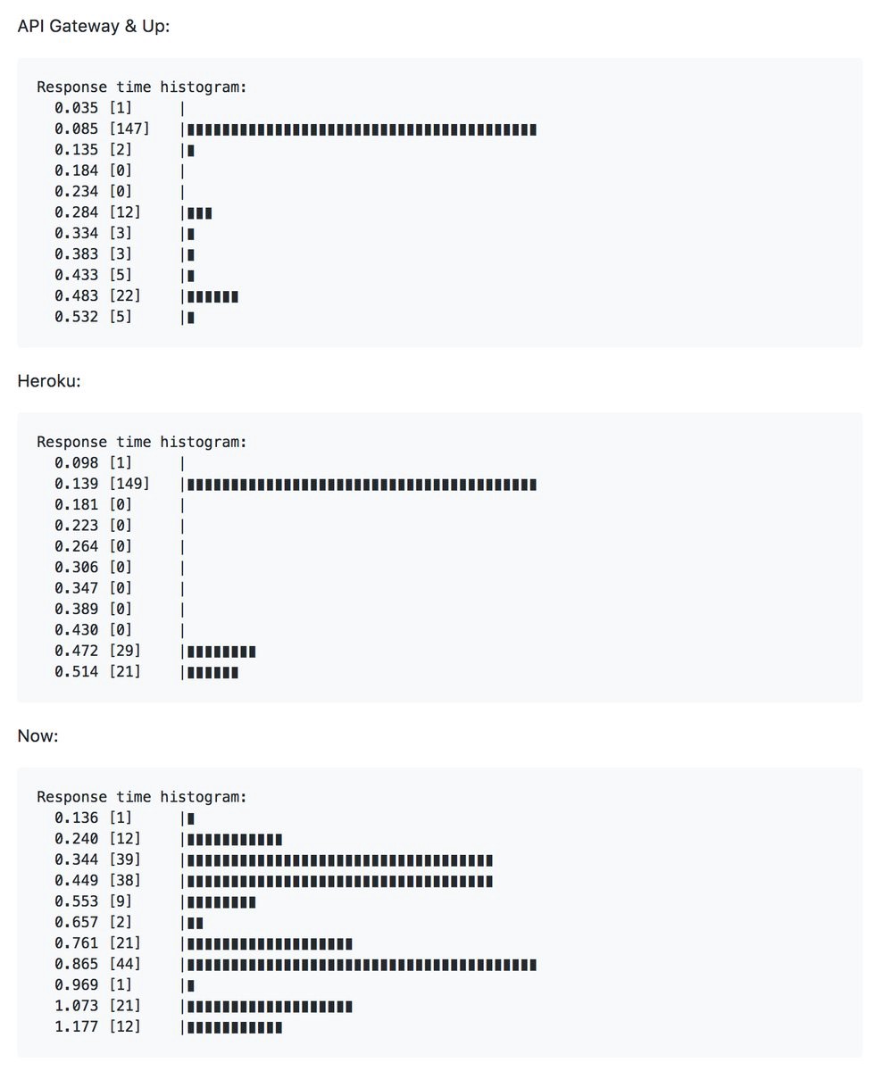 Up 通过 API 网关支持 HTTP/2,对于服务很多资源的应用和站点可以减少延迟。我将来会对许多平台进行更全面的测试,但是 Up 的延迟已经很好了: