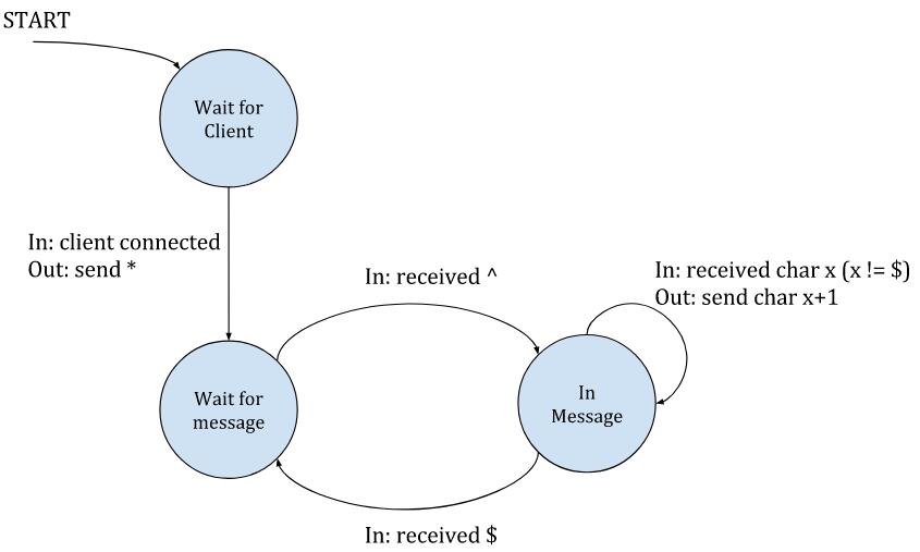总之:服务器等待新客户端的连接;当一个客户端连接的时候,服务器会向该客户端发送一个 * 字符,进入“等待消息”的状态。在该状态下,服务器会忽略客户端发送的所有字符,除非它看到了一个 ^ 字符,这表示一个新消息的开始。这个时候服务器就会转变为“正在通信”的状态,这时它会向客户端回送数据,把收到的所有字符的每个字节加 1 回送给客户端 注1 。当客户端发送了 $ 字符,服务器就会退回到等待新消息的状态。^ 和 $ 字符仅仅用于分隔消息 —— 它们不会被服务器回送。