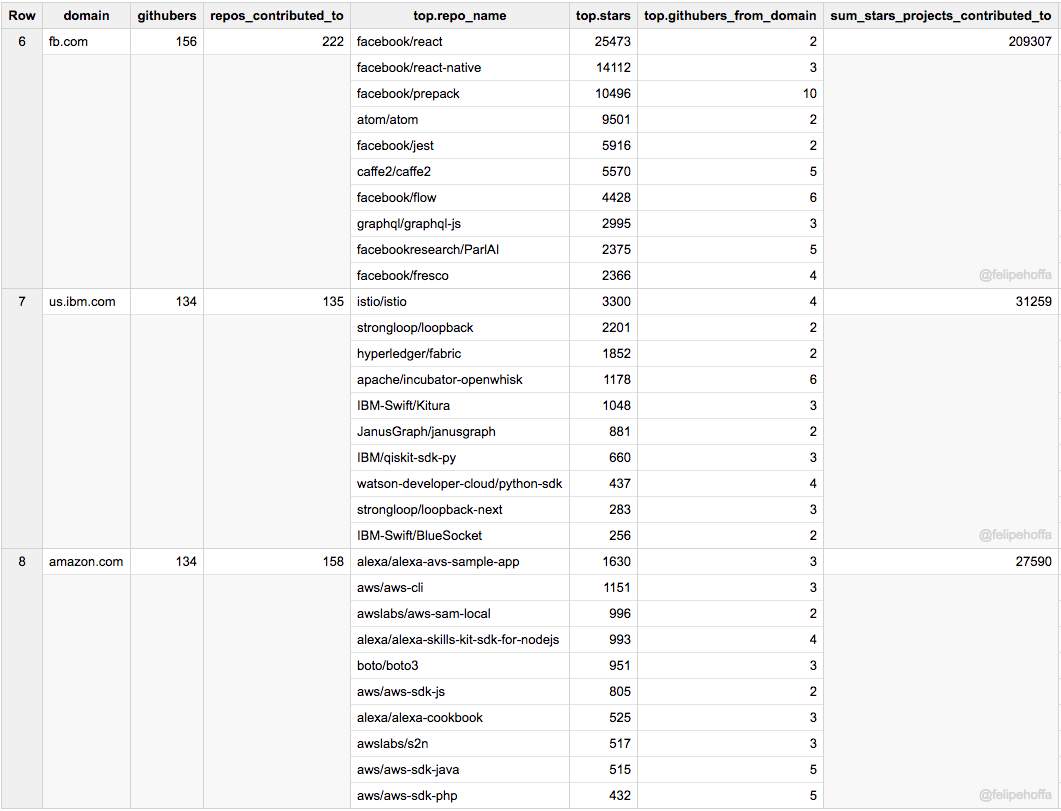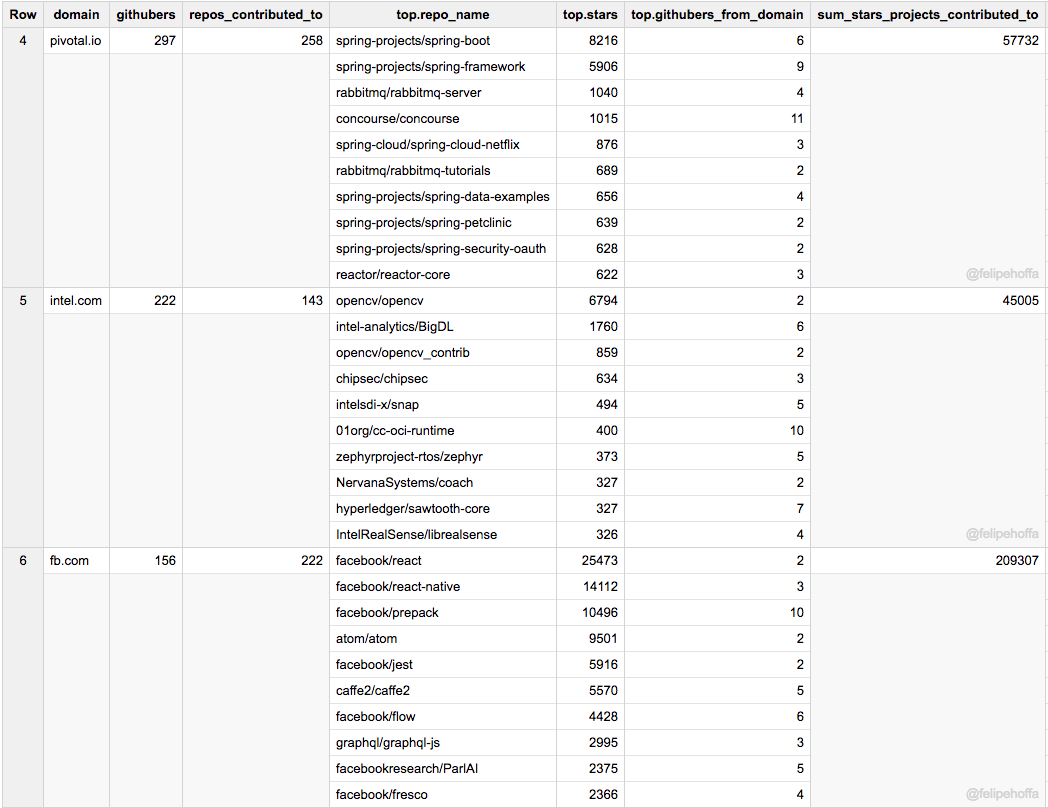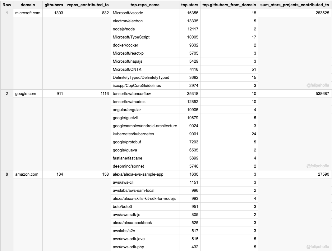在 GitHub 上判定每个用户所属的公司并不容易,但是我们可以使用其推送事件的提交消息中展示的邮件地址域名来判断。