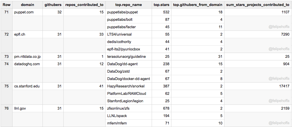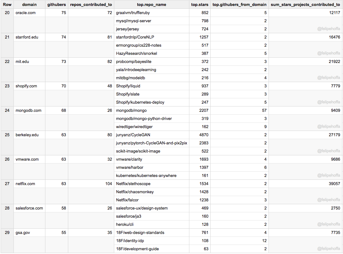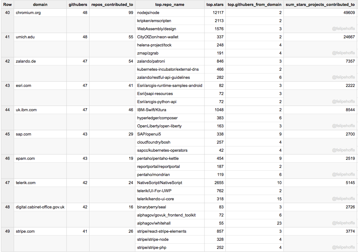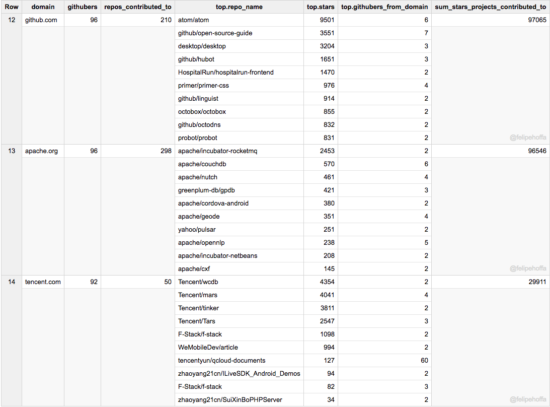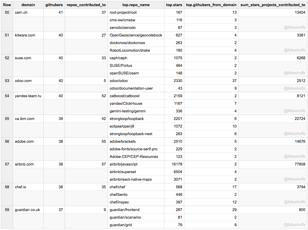 • 不是每个用户都在 GitHub 上使用其组织的邮件。有许多人使用 gmail.com、users.noreply.github.com 和其它邮件托管商的邮件地址。有时候这是为了保持匿名和保护其公司邮箱,但是如果我不能定位其公司域名,这些用户我就不会统计。抱歉。