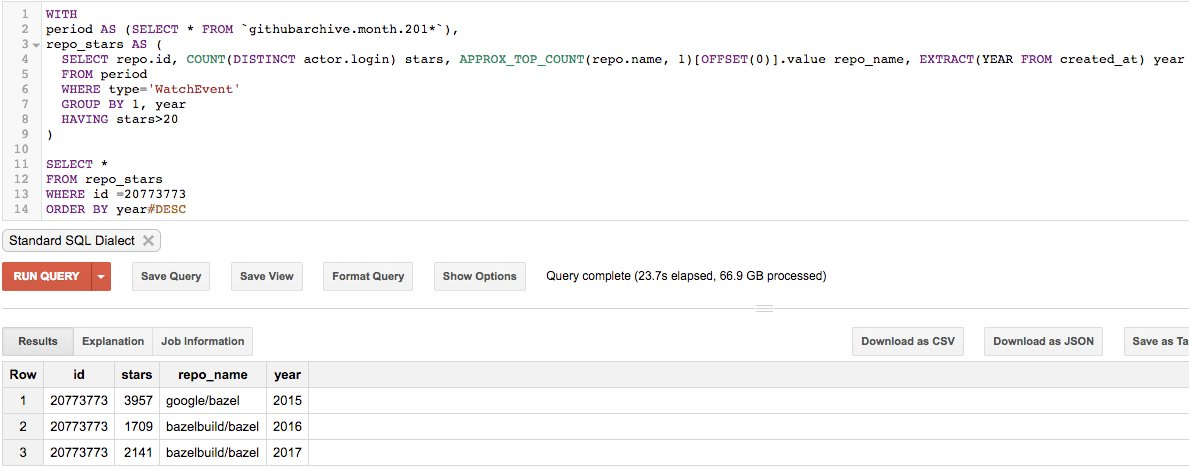 SELECT repo.id, COUNT(DISTINCT actor.login) stars, APPROX_TOP_COUNT(repo.name, 1)[OFFSET(0)].value repo_name