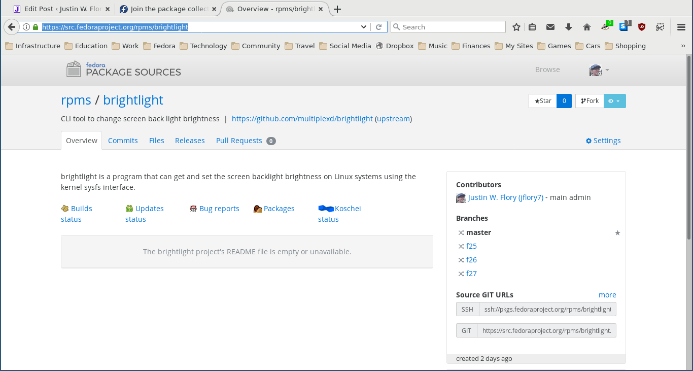 现在,我在 Fedora 25 到 27 上成功校验了我的包,是时候为 Fedora 打包了。第一步是提交这个包,为了请求一个包评估,要在 Red Hat Bugzilla 创建一个新 bug。我为 brightlight 创建了一个工单。因为这是我的第一个包,我明确标注它 “这是我的第一个包”,并且我寻找一个发起人。在工单中,我链接 SPEC 和 SRPM 文件到我的 Git 仓库中。