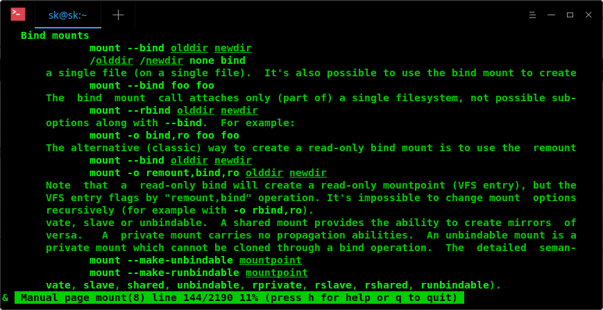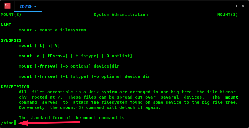 假设你正在查看 mount 命令的 man 页,想要寻找关于 -bind 选项的相关信息。可以输入: