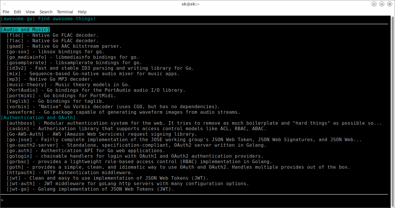 比如,要查看 awesome-go 仓库中的列表,只需要输入:
