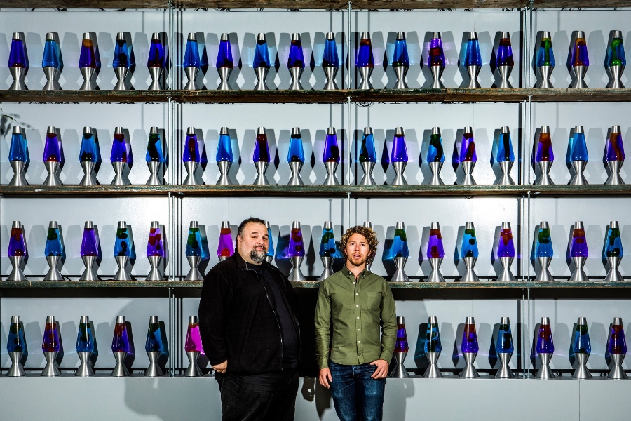 来自 CloudFlare 公司的网络安全专家 Marc Rogers(左)和来自 Lookout 的 Kevin Mahaffey 能够通过直接连接在汽车上的笔记本电脑控制特斯拉汽车进行许多操作。图为他们在 CloudFlare 的大厅里的的熔岩灯前的合影,这些熔岩灯被用来生成密匙。(纽约时报 Credit ,Christie Hemm Klok 拍摄)