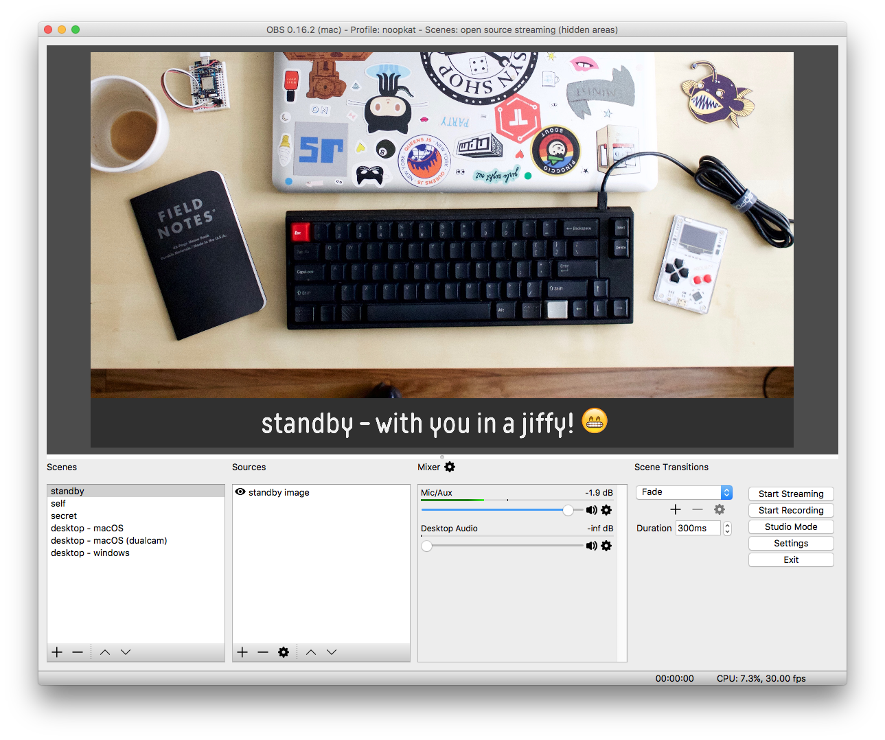 有很多免费的直播软件。我用的是 Open Broadcaster Software (OBS) 。它适用于大多数的平台。我觉得它十分直观且易于入门,但掌握其他的进阶功能则需要一段时间的学习。学好它你会获得很多好处!这是今天我直播时 OBS 的桌面截图(题图)。