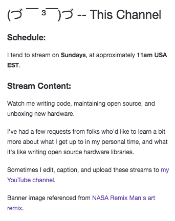 去年 7 月我进行了第一次直播。不像大多数人那样在 Twitch 上进行游戏直播,我想直播的内容是我利用个人时间进行的开源工作。我对 NodeJS 硬件库有一定的研究(其中大部分是靠我自学的)。考虑到我已经在 Twitch 上有了一个直播间,为什么不再建一个更小更专业的直播间,比如 由 JavaScript 驱动的硬件 JavaScript powered hardware ;) 我注册了 我自己的频道 ,从那以后我就开始定期直播。