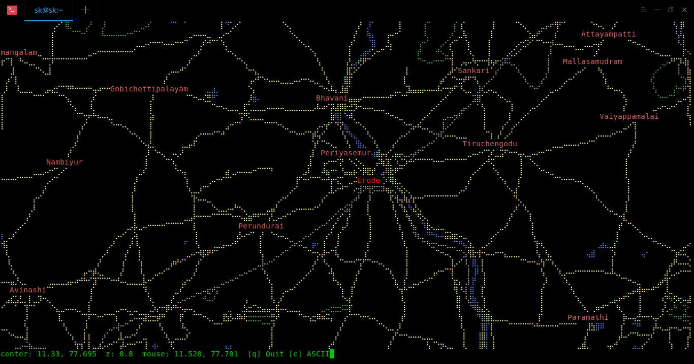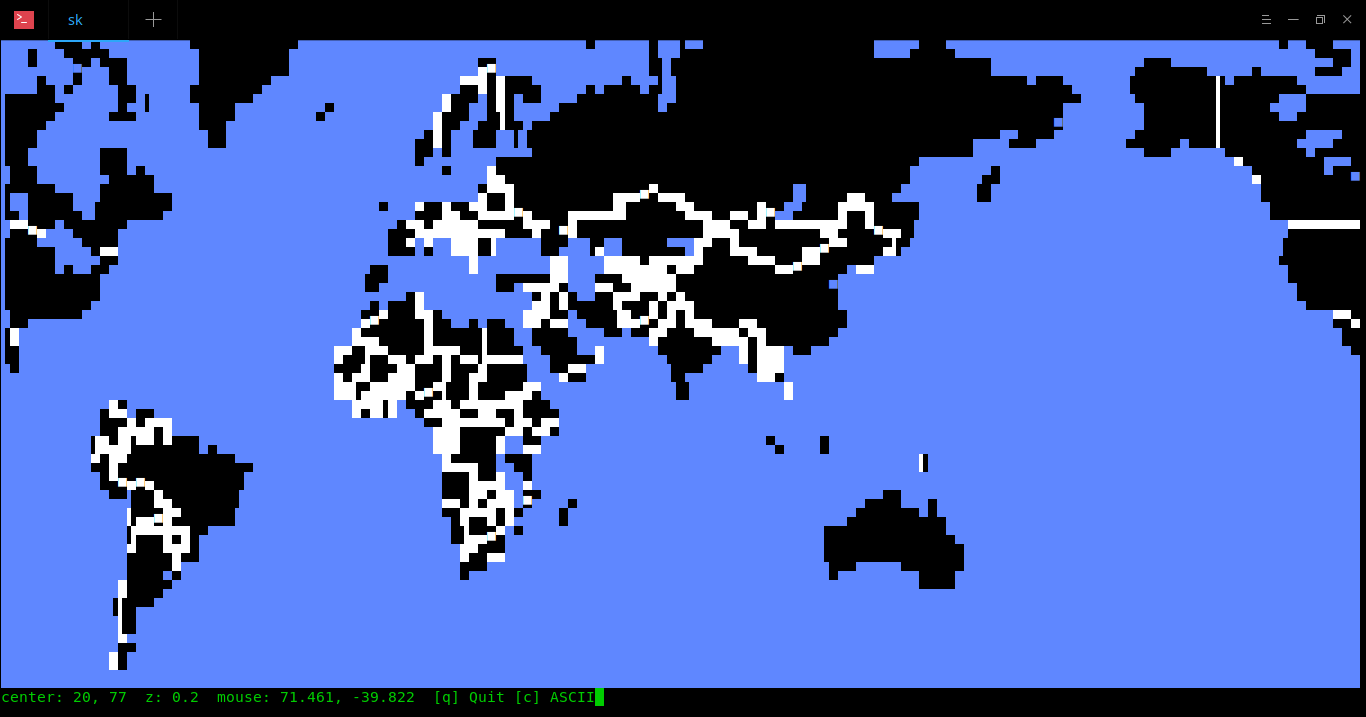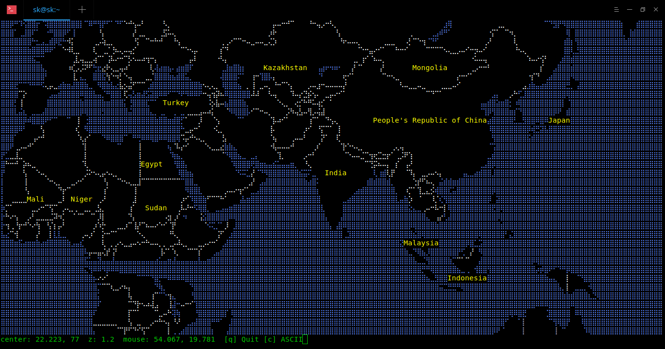 我偶然发现了一个有趣的工具。在终端里的世界地图!是的,这太酷了。给 MapSCII 打 call,这是可在 xterm 兼容终端上渲染的布莱叶盲文和 ASCII 世界地图。它支持 GNU/Linux、Mac OS 和 Windows。我原以为它只不过是一个在 GitHub 上托管的项目而已,但是我错了!他们做的事令人印象深刻。我们可以使用我们的鼠标指针在世界地图的任何地方拖拽放大和缩小。其他显著的特性是: