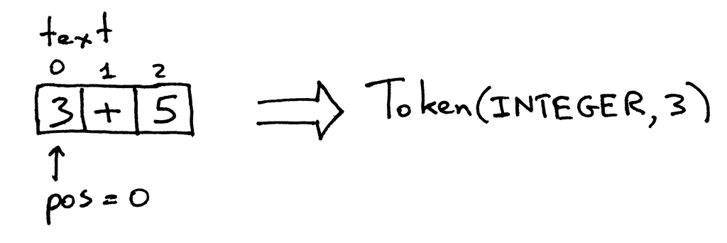 Interpreter 类中的 get_next_token 方法就是词法分析器。每次调用它的时候,你都能从传入解释器的输入字符中获得创建的下一个标记。仔细看看这个方法,看看它是如何完成把字符转换成标记的任务的。输入被存在可变文本中,它保存了输入的字符串和关于该字符串的索引(把字符串想象成字符数组)。pos 开始时设为 0,指向字符 ‘3’。这个方法一开始检查字符是不是数字,如果是,就将 pos 加 1,并返回一个 INTEGER 类型的标记实例,并把字符 ‘3’ 的值设为整数,也就是整数 3: