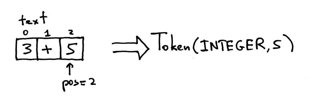 pos 现在指向字符 ‘5’。当你再调用 get_next_token 方法时,该方法会检查这是不是个数字,就是这样,然后它把 pos 加 1,返回一个新的 INTEGER 标记,该标记的值被设为整数 5: