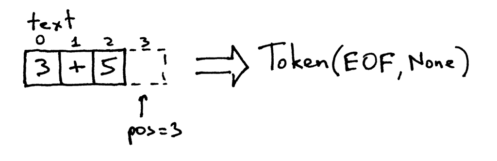 因为 pos 索引现在到了字符串 “3+5” 的末尾,你每次调用 get_next_token 方法时,它将会返回 EOF 标记: