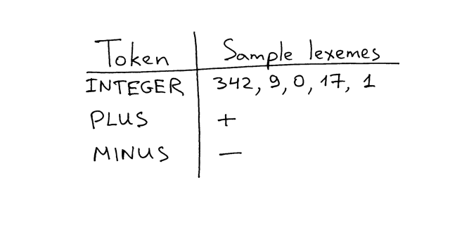 你已经知道了标记。但是为了让我详细的讨论标记,我需要谈一谈词法。词法是什么? 词法 lexeme 是一个 标记 token 中的字符序列。在下图中你可以看到一些关于标记的例子,这可以让它们之间的关系变得清晰: