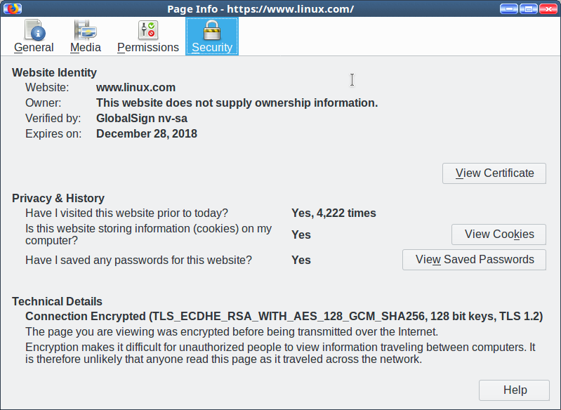 当你访问一个 HTTPS 网站时,网站给你的网页浏览器返回了一个数字证书。这个证书说明你的会话被强加密,而且提供了该网站信息,包括组织名称、颁发证书的组织和证书颁发机构名称等。你可以点击网页浏览器地址栏的小锁头来查看这些信息(图 1),也包括了证书本身。