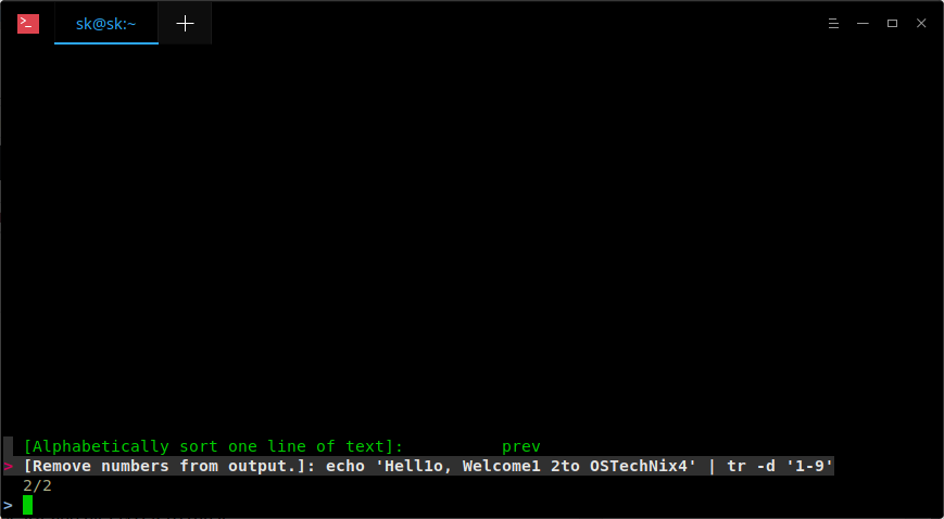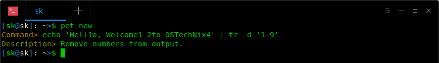 这是一个简单的命令,用于从 echo 命令输出中删除所有数字。你可以很轻松地记住它。但是,如果你很少使用它,几天后你可能会完全忘记它。当然,我们可以使用 CTRL+R 搜索历史记录,但 Pet 会更容易。另外,Pet 可以帮助你添加任意数量的条目。