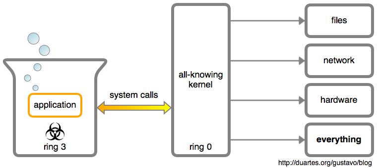它与外部世界的每个交流都要在内核的帮助下通过系统调用才能完成。一个应用程序要想保存一个文件、写到终端、或者打开一个 TCP 连接,内核都要参与。应用程序是被内核高度怀疑的:认为它到处充斥着 bug,甚至是个充满邪恶想法的脑子。