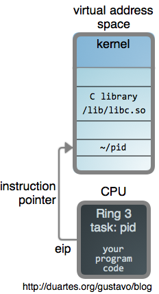 它有一个私有的 虚拟地址空间—— 它自己的内存沙箱。整个系统都在它的地址空间中(即上面比喻的那个“瓮”),程序的二进制文件加上它所使用的库全部都 被映射到内存中。内核自身也映射为地址空间的一部分。