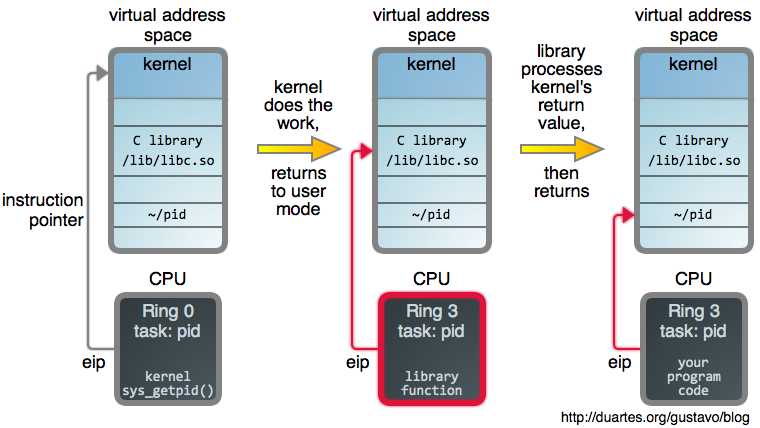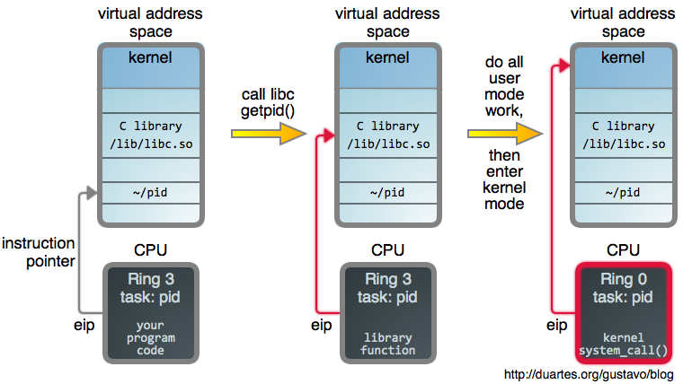 它的第一步是开始于调用 C 库的 getpid(),它是系统调用的一个封装。当你调用一些函数时,比如,open(2)、read(2) 之类,你是在调用这些封装。其实,对于大多数编程语言在这一块的原生方法,最终都是在 libc 中完成的。