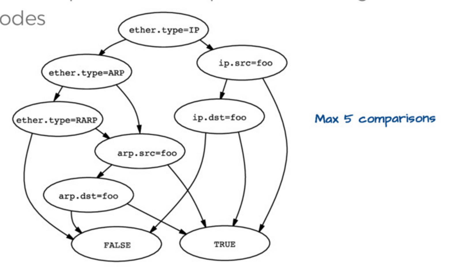 然后,如果你设置 ether.type = IP 和 ip.src = foo,你必然明白匹配的包是 host foo,你也不用去检查任何其它的东西了。因此,这个数据结构(它们称为“控制流图” ,或者 “CFG”)是表示你真实希望去执行匹配检查的程序的最佳方法,而不是用前面的树。