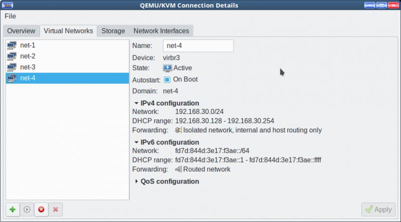 在 KVM 中你至少需要两个虚拟机。当然了,如果你愿意,也可以创建更多的虚拟机。在我的系统中有 Fedora、Ubuntu、以及 openSUSE。去创建一个新的 IPv6 网络,在主虚拟机管理窗口中打开 “Edit > Connection Details > Virtual Networks”。点击左下角的绿色十字按钮去创建一个新的网络(图 1)。