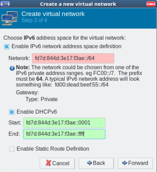 给新网络输入一个名字,然后,点击 “Forward” 按钮。如果你愿意,也可以不创建 IPv4 网络。当你创建一个新的 IPv4 网络时,虚拟机管理器将不让你创建重复网络,或者是使用了一个无效地址。在我的宿主机 Ubuntu 系统上,有效的地址是以绿色高亮显示的,而无效地址是使用高亮的玫瑰红色调。在我的 openSUSE 机器上没有高亮颜色。启用或不启用 DHCP,以及创建或不创建一个静态路由,然后进入下一个窗口。
