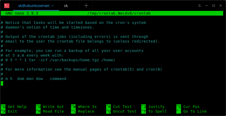 选择适合你的编辑器。这里是一个示例 crontab 文件的样子。