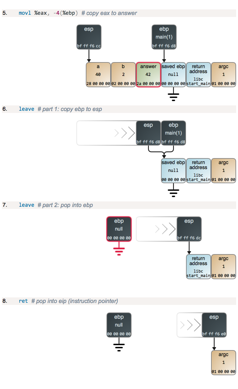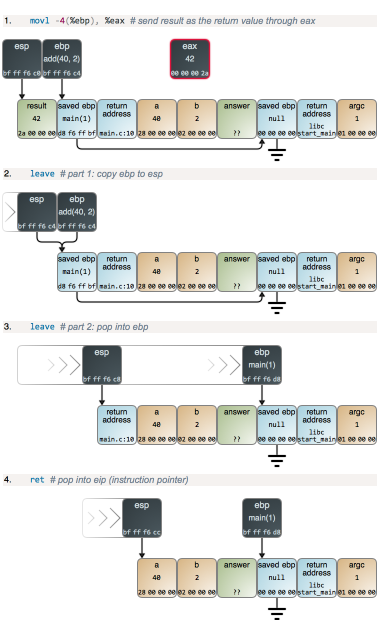 第一个指令是有些多余而且有点傻的,因为我们知道 eax 已经等于 result 了,但这就是关闭优化时得到的结果。leave 指令接着运行,这一小段做了两个任务:重置 esp 并将它指向到当前栈帧开始的地方,另一个是恢复在 ebp 中保存的值。这两个操作在逻辑上是独立的,因此,在图中将它们分开来说,但是,如果你使用一个调试器去跟踪,你就会发现它们都是自动发生的。