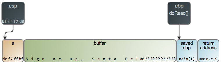 上面的代码中使用了 gets 从标准输入中去读取内容。gets 持续读取直到一个新行或者文件结束。下图是读取一个字符串之后栈的示意图: