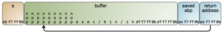 在这里存在的问题是,gets 并不知道缓冲区(buffer)大小:它毫无查觉地持续读取输入内容,并将读取的内容填入到缓冲区那边的栈,清除保存在 ebp 中的值、返回地址,下面的其它内容也是如此。对于利用这种行为,攻击者制作一个精密的载荷并将它“喂”给程序。在这个时候,栈应该是下图所示的样子,然后去调用 gets:
