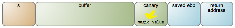幸亏,现代操作系统有了 防止缓冲区溢出 的一系列保护措施,包括不可执行的栈和 栈内金丝雀 stack canary 。这个 “ 金丝雀 canary ” 名字来自 煤矿中的金丝雀 canary in a coal mine 中的表述(LCTT 译注:指在过去煤矿工人下井时会带一只金丝雀,因为金丝雀对煤矿中的瓦斯气体非常敏感,如果进入煤矿后,金丝雀死亡,说明瓦斯超标,矿工会立即撤出煤矿。金丝雀做为煤矿中瓦斯预警器来使用),这是对计算机科学词汇的补充,用 Steve McConnell 的话解释如下: