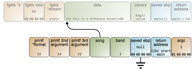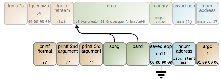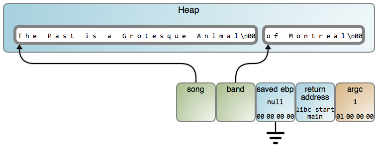 乐队名字被读入到相同的内存位置,并且覆盖了前面存储的歌曲名字。band 和 song 最终都准确指向到相同点。最后,我们甚至都不能得到 “of Montreal”(LCTT 译注:一个欧美乐队的名字) 的正确输出。你能猜到是为什么吗?
