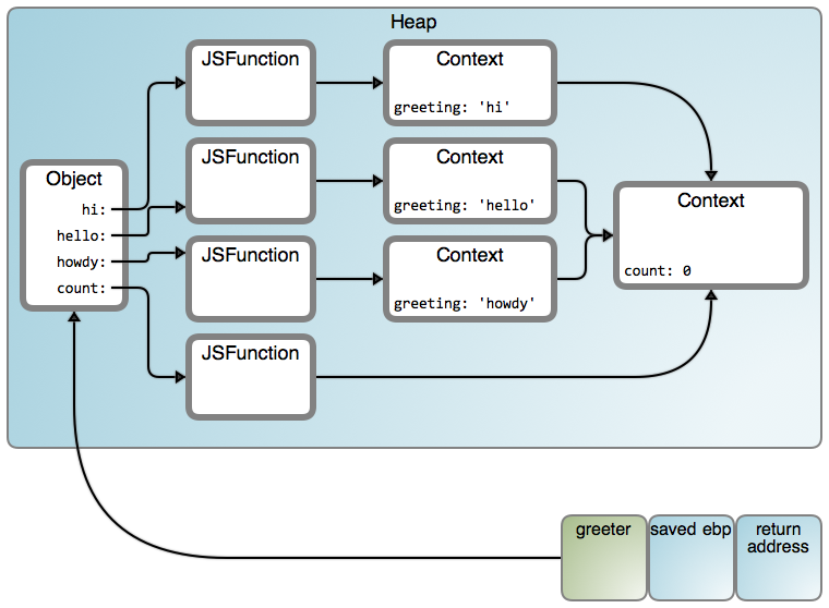 是的,count() 在工作,但是我们的 greeter 是在 howdy 中的栈上。你能告诉我为什么吗?我们使用 count 是一条线索:尽管词法域进入一个堆对象中被关闭,但是变量(或者对象属性)带的值仍然可能被改变。下图是我们拥有的内容(LCTT 译注:映射从左到右“Object”、“JSFunction”和“Context”分别链接至 #1671 行、#7245 行和 #188 行):