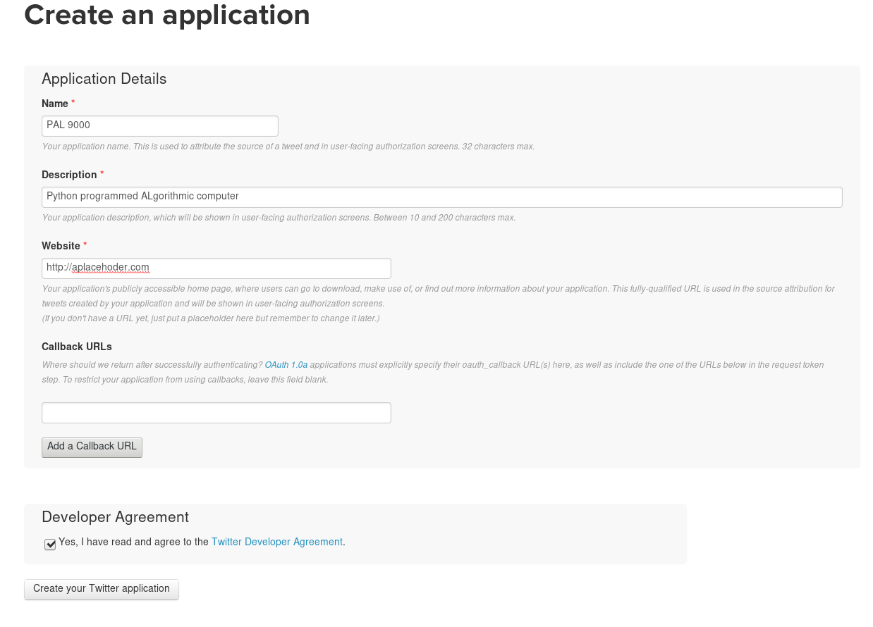 要使用 Twitter API ,机器人需要通过 Twitter 的授权。为了解决这个问题, tweepy 使用了 OAuth 授权标准。你可以通过在 https://apps.twitter.com/ 创建一个新的应用来获取到凭证。