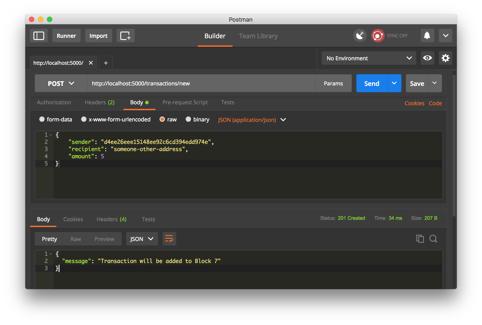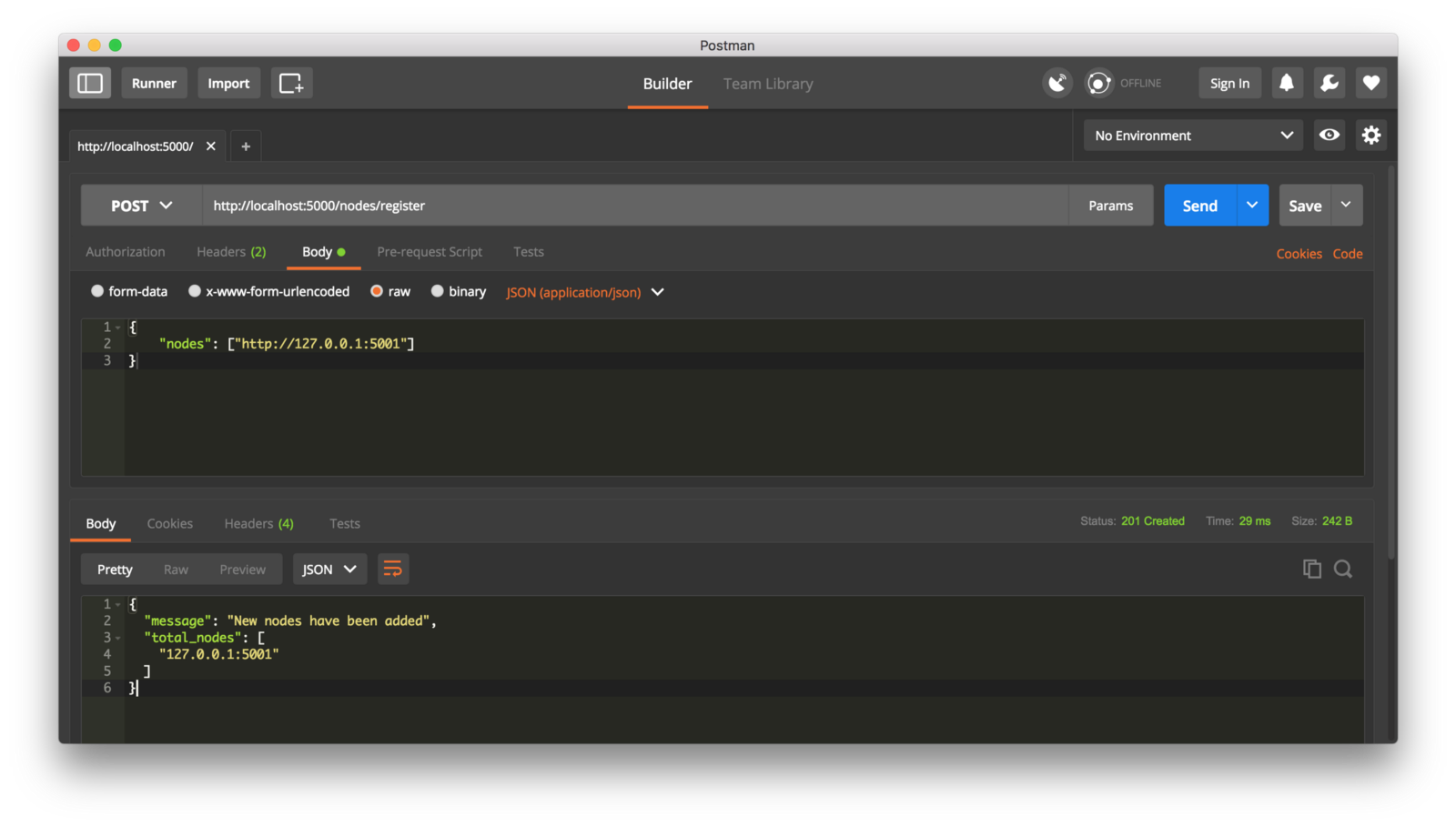 这种情况下,如果你愿意,可以使用不同的机器来做,然后在你的网络上启动不同的节点。或者是在同一台机器上使用不同的端口启动另一个进程。我是在我的机器上使用了不同的端口启动了另一个节点,并将它注册到了当前的节点上。因此,我现在有了两个节点:http://localhost:5000 和 http://localhost:5001。
