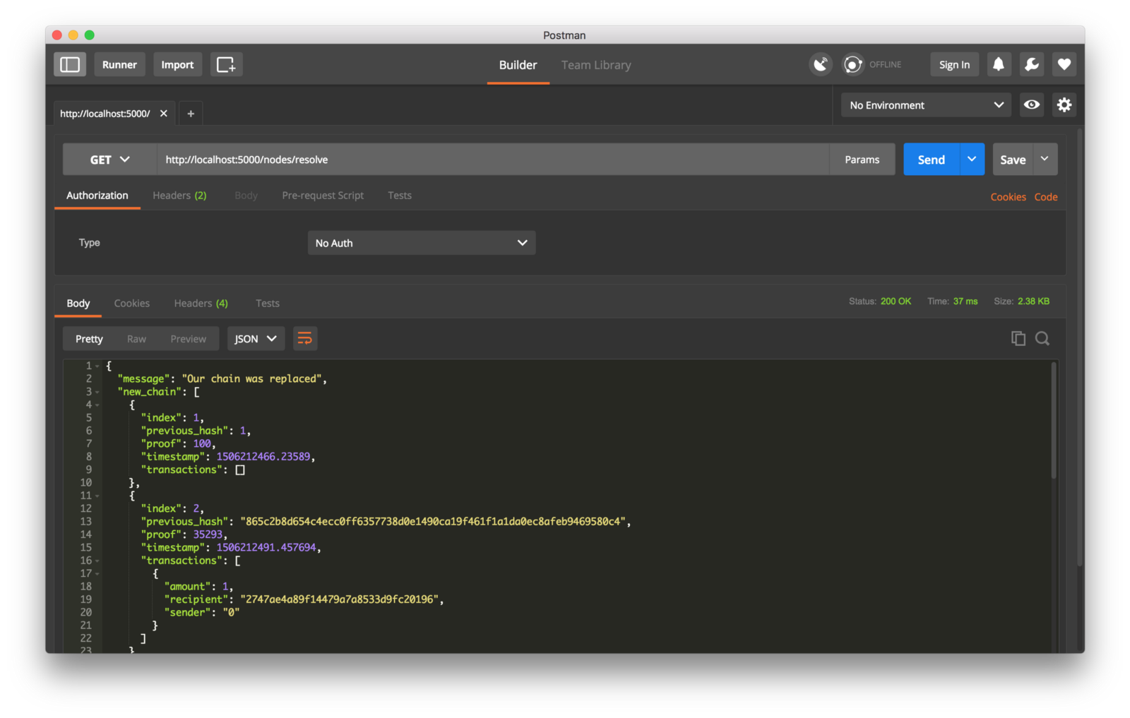 我接着在节点 2 上挖出一些新区块,以确保这个链是最长的。之后我在节点 1 上以 GET 方式调用了 /nodes/resolve,这时,节点 1 上的链被共识算法替换成节点 2 上的链了: