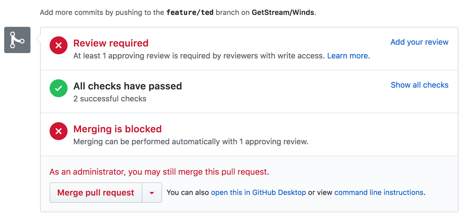 我们的集成非常简单 —— 我们用 [.travis.yml] 文件设置环境,通过简单的 npm 命令进行测试。测试覆盖率反馈给 GitHub,在 GitHub 上我们将清楚地看出我们最新的代码或者 PR 是不是通过了测试。GitHub 集成很棒,因为它可以自动查询 Travis CI 获取结果。以下是一个在 GitHub 上看到 (经过了测试的) PR 的简单截图: